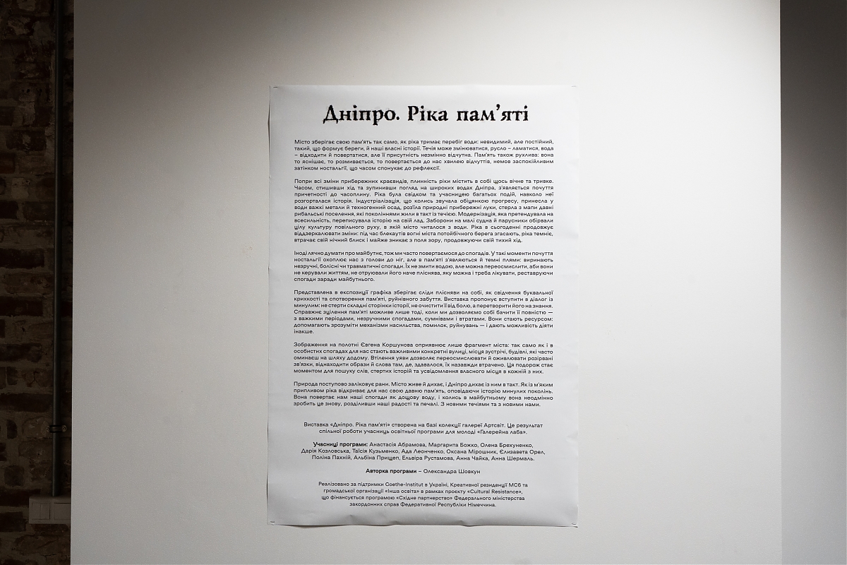 Виставка «Дніпро. Ріка пам'яті» створена на базі колекції галереї Артсвіт. Це результат спільної роботи учасниць освітньої програми для молоді «Галерейна Лаба».