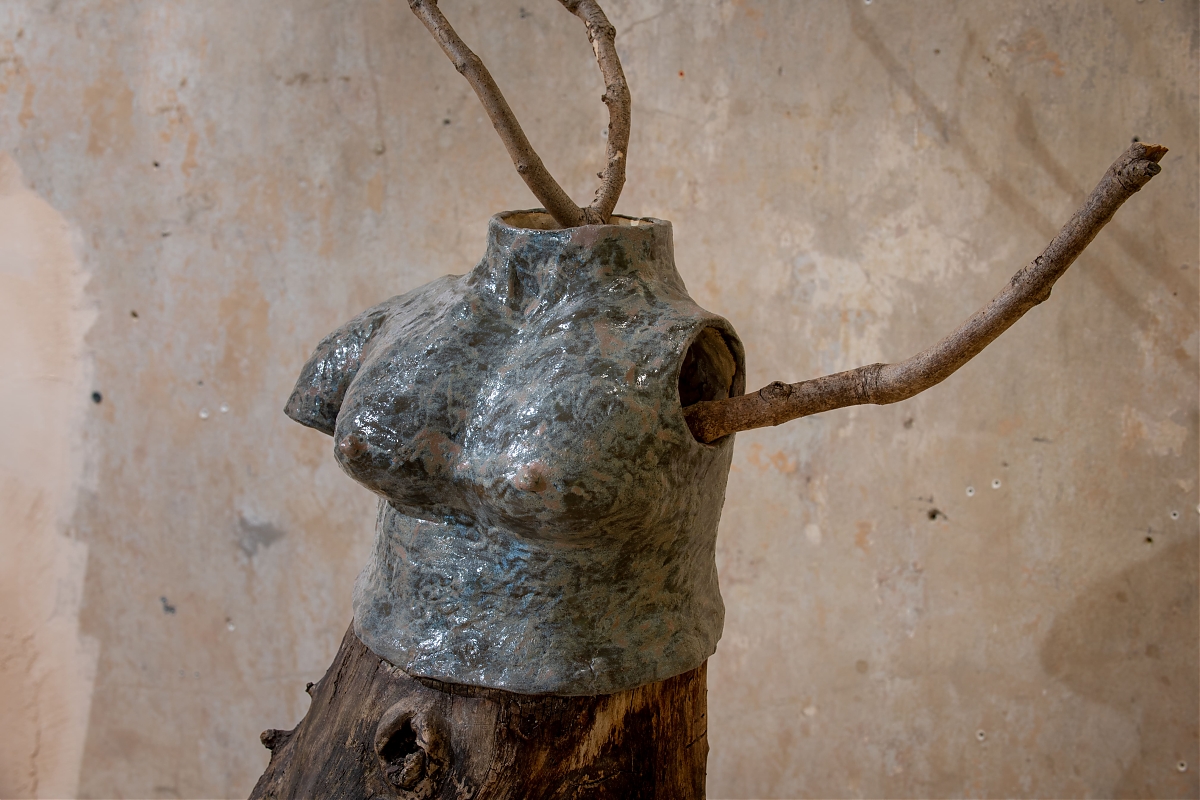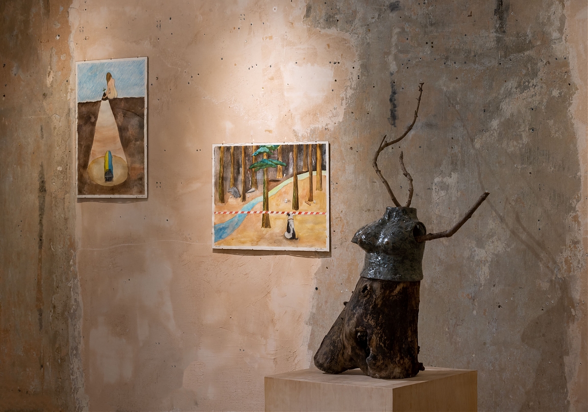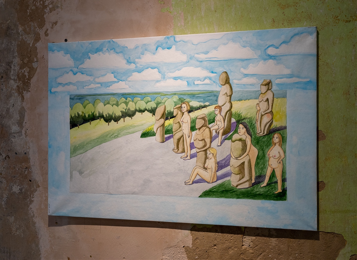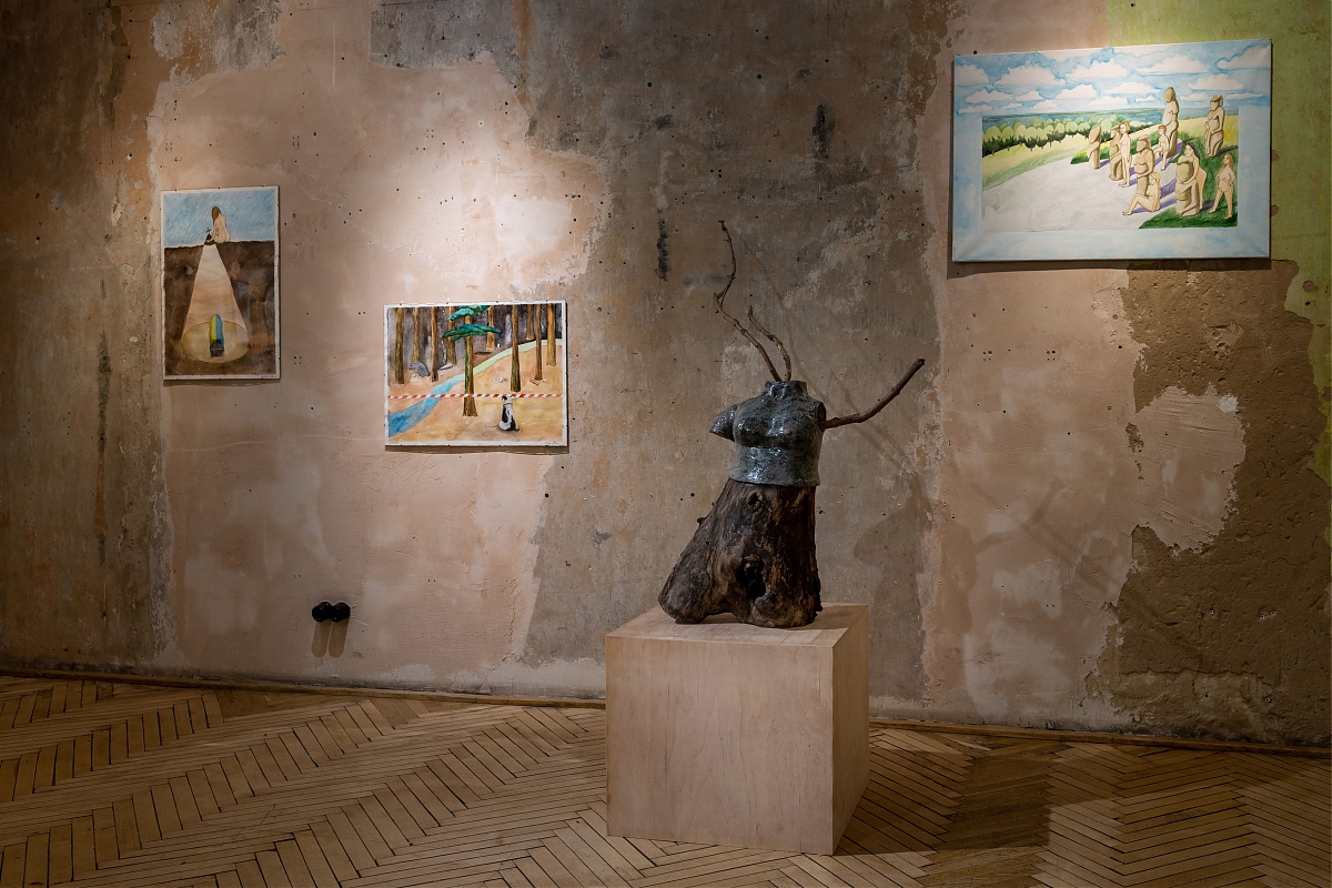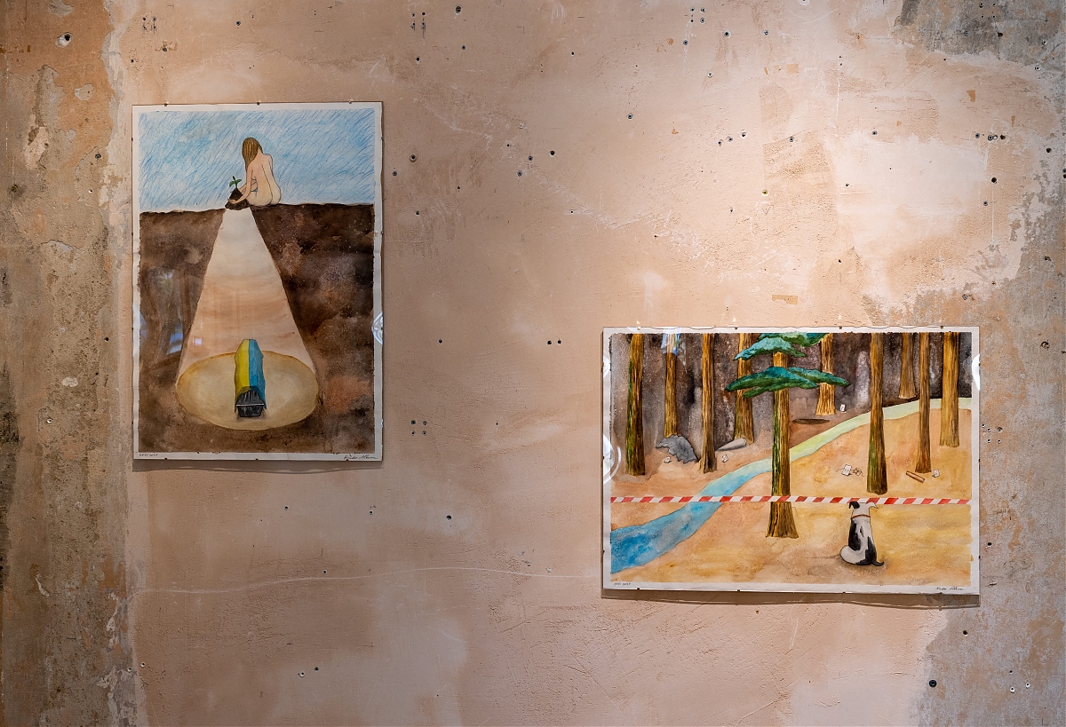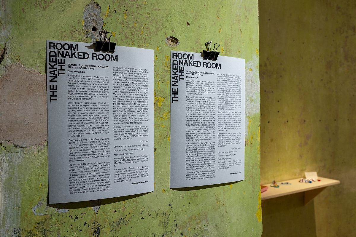 На виставці "Земля під нігтями нагадує мені запечену кров" сплелося багато історій та свідчень. Проєкт Secondary Archive, учасницями якого є художниці, представлені в експозиції, починався як спроба зафіксувати пряму мову мисткинь, коли їхня роль у мистецькому середовищі все ще крихка. Коли чоловіки починають війни, голоси жінок можуть ставати тихішими. Громадська організація Північна культурна столиця зібрала свідчення жінок, які пережили окупацію Чернігівщини. В діалозі з цими історіями створена робота Ольги Кузюри, сім’я якої також походить з цього регіону. Kinder Album представила серію робіт, натхненних некрологами та історіями пам’яті з деокупованої Харківщини, зібраними проєктом Меморіал. У своїй роботі Дар’я Молокоєдова працює з образом власного дому дитинства, який залишається недоступним у прифронтовому Краматорську. Маргарита Половінко, волонтерка-парамедикиня, власною кров’ю змальовує пейзажі – подекуди абстрактні, подекуди – із впізнаваними краєвидами її рідного Кривого Рогу. З ними римується панорама Чорного моря Даші Чечушкової, що її художниця закарбувала після підриву росіянами дамби Каховського водосховища. Врешті, цей діалог виходить за межі сьогоднішньої війни в Україні. Анна Звягінцева звертається до почутої у дитинстві поради завжди мати при собі солодощі.