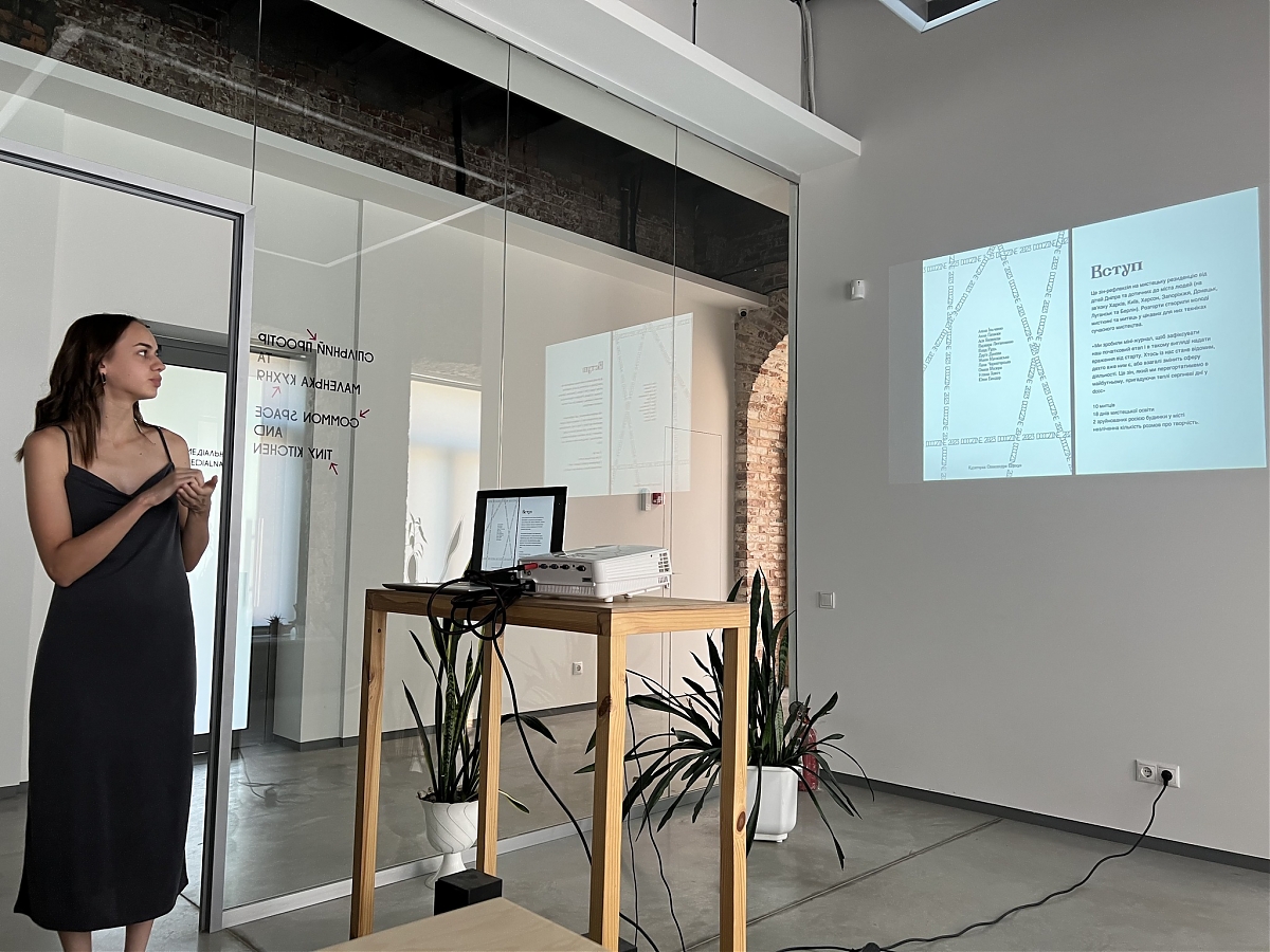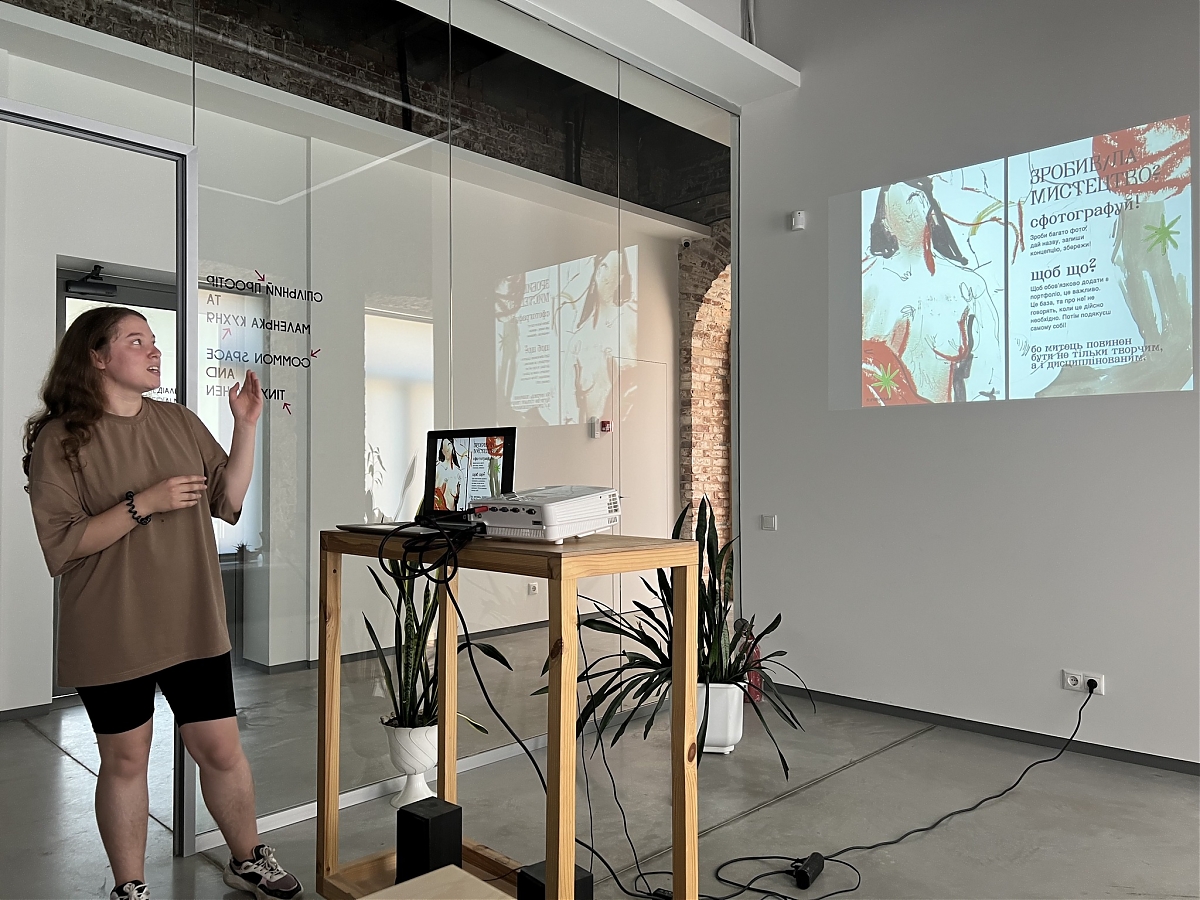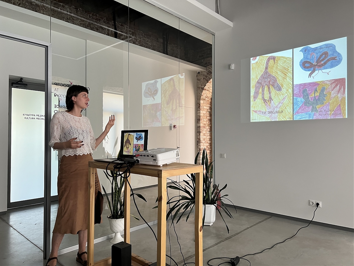 — мисткиня Olia Fedorova, яка свою лекцію присвятила темі пошуку можливостей для творчої самореалізації: художниця розповіла резидентам/-кам як подаватися на резиденції та де шукати гранти, про важливість концепцій до своїх робіт і як зробити цікаве портфоліо або CV, а ще поділилася своїми лайфгаками в написанні заявок і вказала на головні помилки початківців;