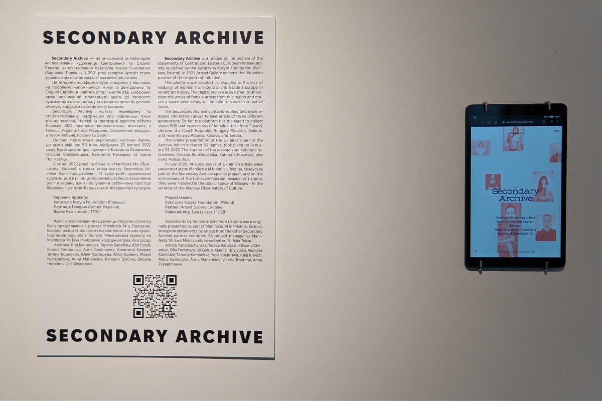 "Secondary Archive" — це унікальний онлайн-архів висловлювань художниць Центральної та Східної Європи, започаткований Katarzyna Kozyra Foundation (Варшава, Польща). У 2021 році галерея Артсвіт стала українським партнером цієї важливої ініціативи.