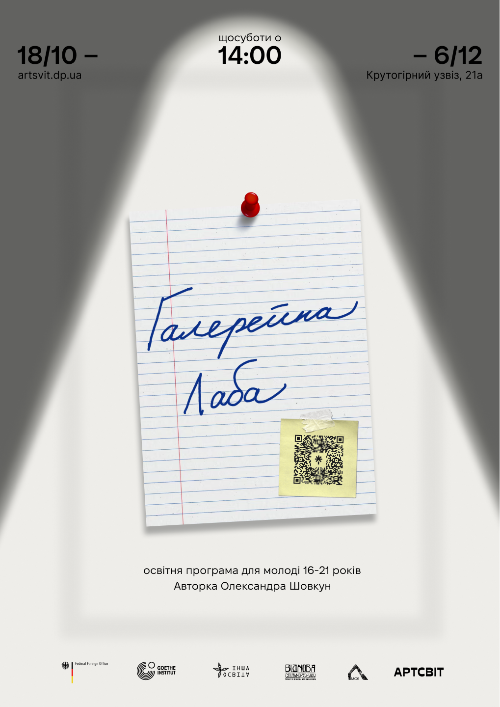 Артсвіт запускає нову освітню програму «Галерейна лаба» для молоді віком від 16 до 21 року. Проєкт покликаний відкрити виставку зсередини та показати її як спільний результат командної роботи. Учасники та учасниці розберуть виставковий проєкт на складові й пройдуть усі етапи підготовки групової експозиції — від формування концепції до відкриття. Матеріалом для виставки стануть роботи з колекції галереї Артсвіт.